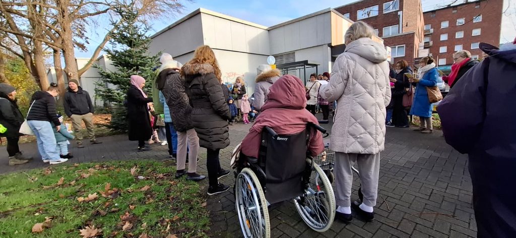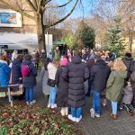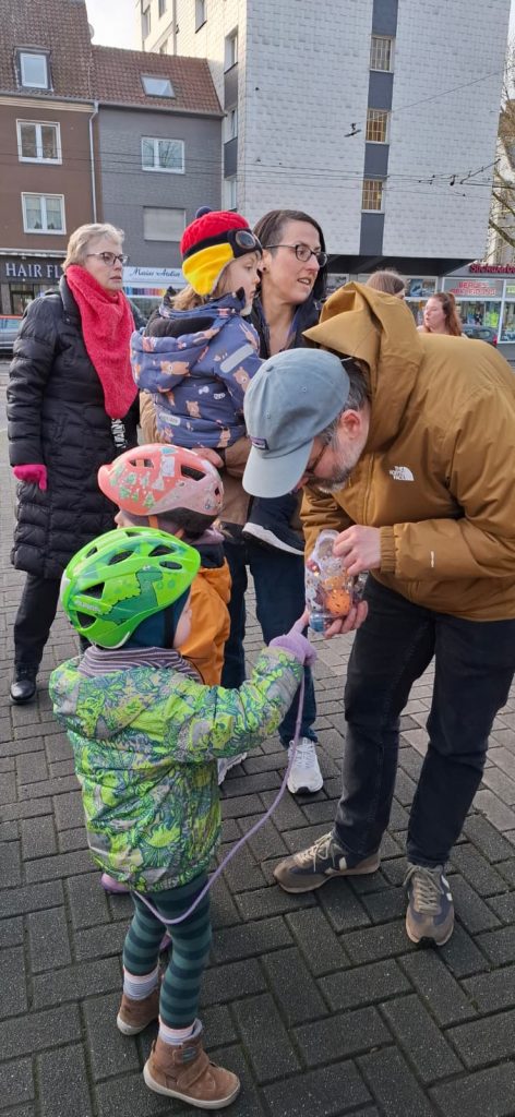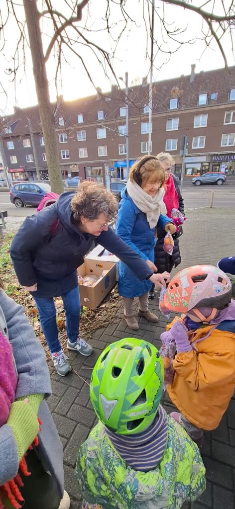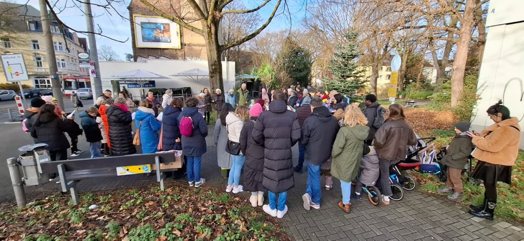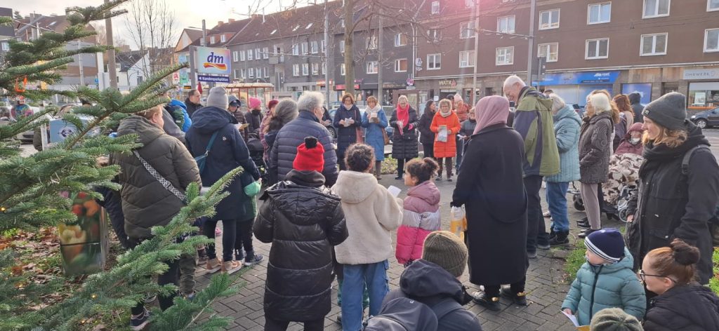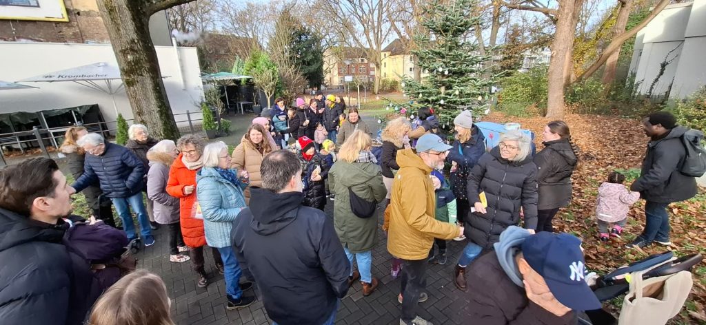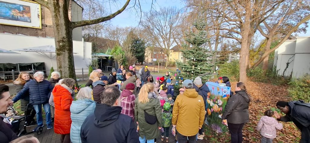Die Körneschaft hatte zum traditionellen Weihnachtsbaumschmücken im Körner Ortskern eingeladen. Kinder verschiedener Einrichtungen aus dem Vorort brachten selbst gebastelten Baumschmuck mit und verwandelten die vorbereitete Tanne in einen Weihnachtsbaum. Dann kam das Weihnachtslieder-Heft der Körneschaft zum Einsatz. Nach einer kurzen Begrüßung durch die Vorsitzende des Gewerbevereins, Angelika Schröder, sangen alle Anwesenden Weihnachtslieder. Auch einige Seniorinnen und Senioren des Körner Allo-Heims haben kräftig mitgesungen. Selbstverständlich bekamen alle Kinder jeweils eine sehr schön verpackte Weihnachtstüte, gefüllt mit Süßem und Gesundem, gespendet von REWE Smeets.