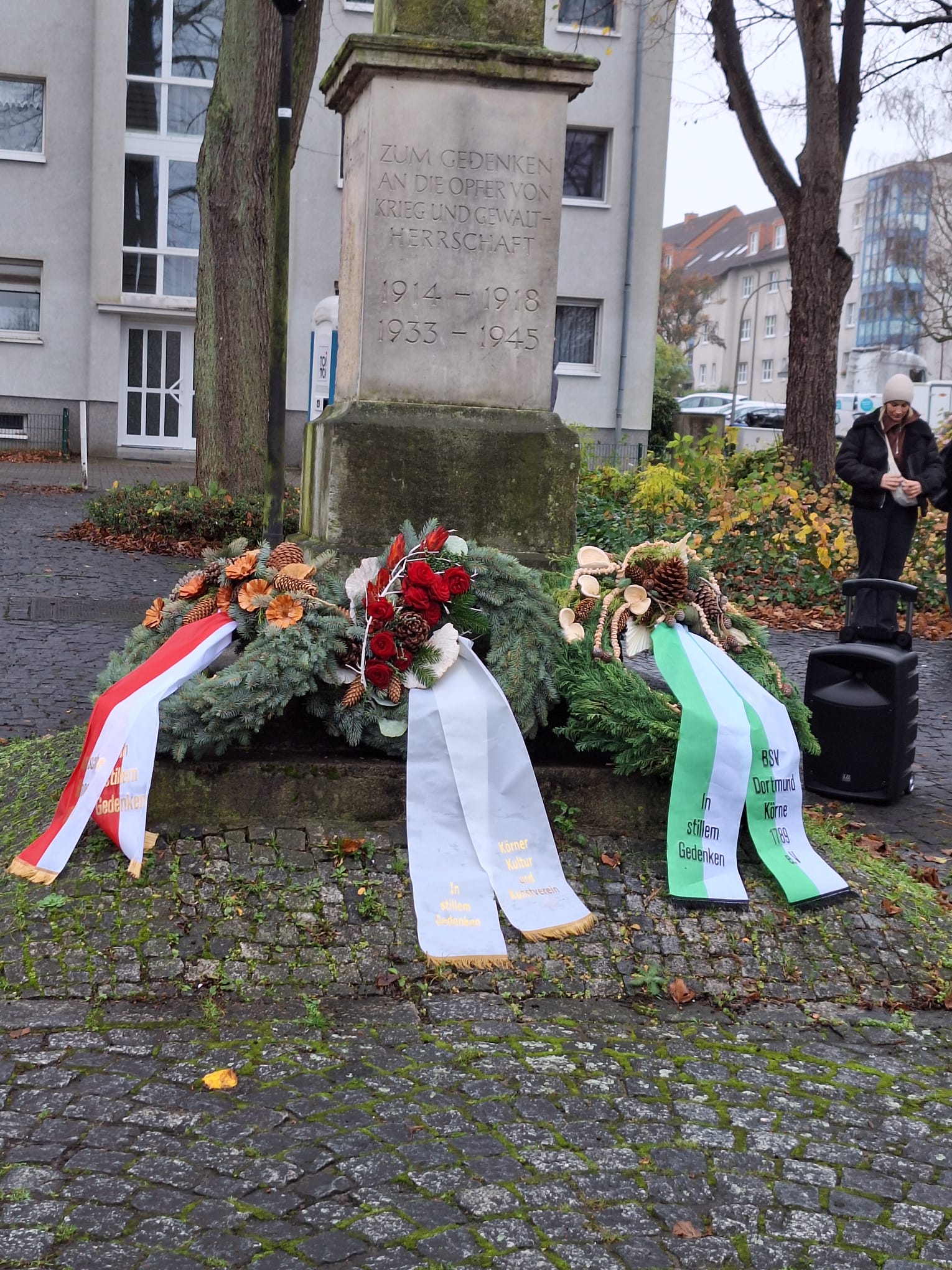 Anders als in den vergangenen Jahren ist der Körner Weihnachtsbaum nicht am Gedenkstein befestigt. Der Baum steht ein paar Meter zurückgesetzt auf der Rasenfläche. Auf Initiative der Körneschaft hat das Tiefbauamt der Stadt Dortmund eine Bodenhülse installiert.